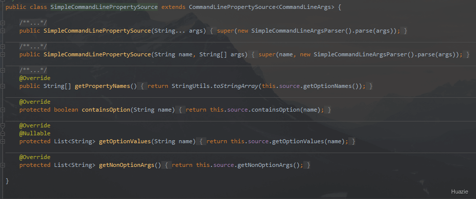 这个 Source 类是对 SimpleCommandLinePropertySource 的一个简单封装,可以看到它这里只是简单地调用了父类的实现,没有添加任何新的功能或逻辑。当然就目前而言,这个类似乎是多余的,Huazie 猜测这也许是为了将来的扩展吧。